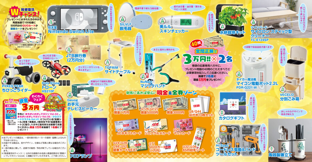 ファン必見のナンプレ専門誌『懸賞ナンプレマガジン』、イラスト満載の大人も子供も楽しめる『懸賞まちがいさがしマガジン』、クロスワード以外にもバラエティ豊かなパズルを収録した『懸賞クロスワードミラクル』。解いて応募して、ステキな賞品をゲットしちゃいましょう♪