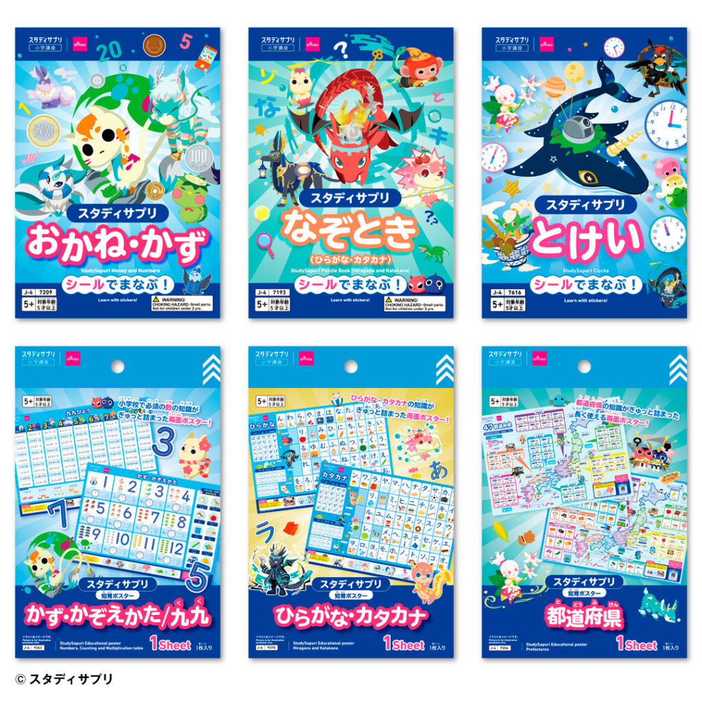 自宅のタブレットやパソコンなどで利用できるオンライン学習サービス スタディサプリを提供しているリクルートとコラボレーションした学習シリーズ。スタディサプリの人気キャラクター「サプモン」と一緒に、シールやポスターで、文字や数、お金、とけい、都道府県などが楽しく学べます。